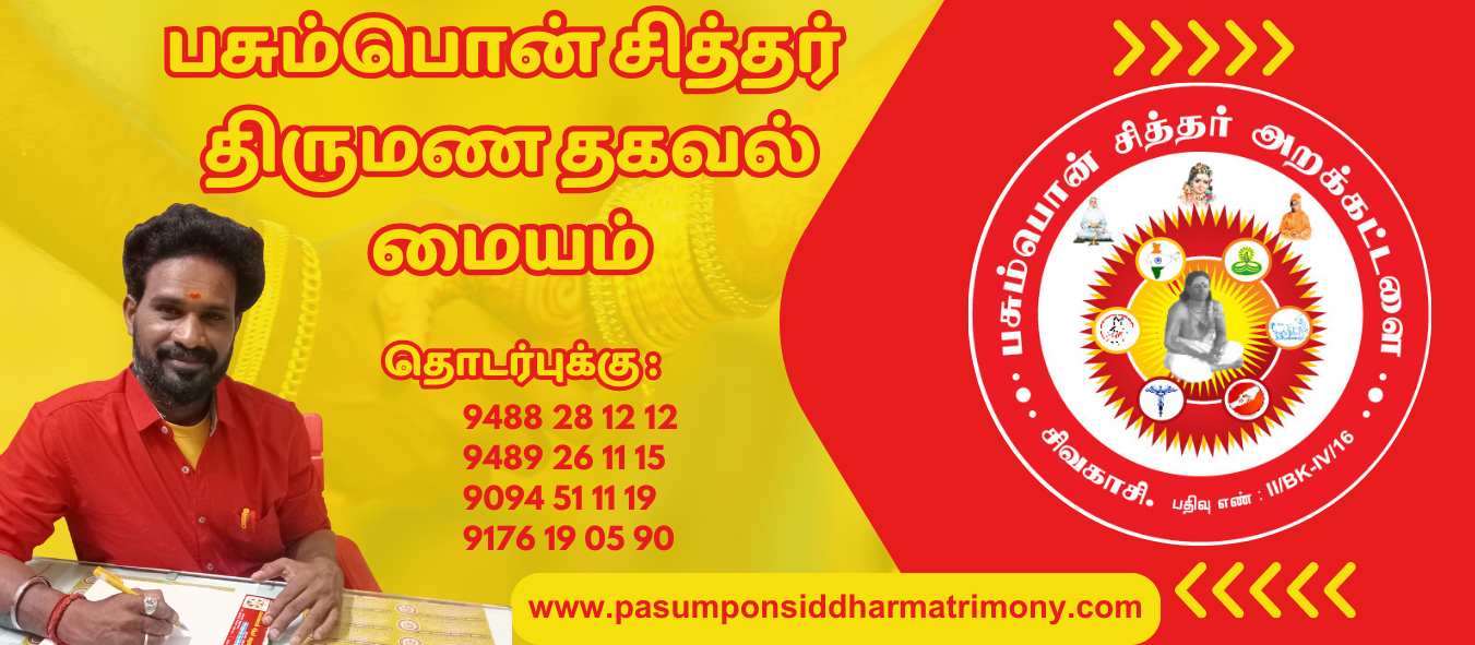 We have launched Pasumpon Siddhar Matrimony Information Center as an online service www.pasumponsiddharmatrimony.com. This matrimonial information center does not work in association with any other matrimonial information center or through marriage brokers. Online service and direct registration to select good boons for their children.
